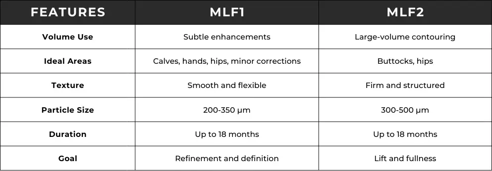 Ambos productos forman parte de un sistema completo de contorno corporal, lo que permite a los profesionales personalizar el tratamiento en función de las necesidades anatómicas y los objetivos del paciente. Muchos profesionales combinan MLF1 y MLF2 en una sola sesión. Para ello, utilizan MLF2 para el volumen y MLF1 para el ajuste fino. Esto les ayuda a crear contornos naturales y uniformes para obtener resultados perfectos.